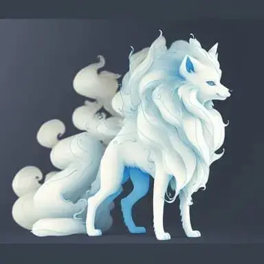 Ninetales is a fox-like, quadruped Pokémon with nine tails. It has yellow fur that covers its body and a tuft of fur on its forehead. Its underside is light blue. It has two large, rounded ears, each with a dark brown inside. The rings on the tip of its tail resemble fire and it can use these to create illusions or light up dark places like caves.