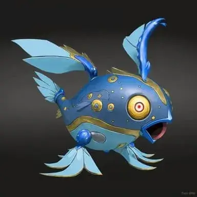 It has four fins: two on its backside, one at each side of its head and one on top of it; making it resemble an anglerfish or an octopus. It has a large, round body with black, blue and yellow scales covering its body.