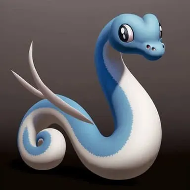Dratini is a serpentine dragon-like Pokémon with blue and yellow scales. It has five red spots on its body—one on its neck, one on either side of its tail, one on the tip of its tail, and one at the base of each horn (which can be broken off if handled improperly).