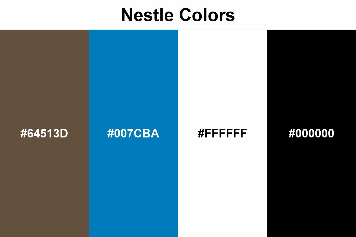 The Nestlé Colors palette combines the warm "oak brown" (#64513D) tone chosen in 2018 to replace gray in the logo with the blue accent (#007CBA) frequently seen in digital media and white/black neutrals.
